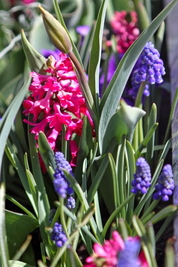 Isn't Miranda fabulous? Hooray for the breeder who came up with this gem. Grape hyacinths (Muscari armeniacum), dwarf 'Tete-a-Tete' daffodils and deep pink 'Jan Bos' hyacinths form the underplanting.
